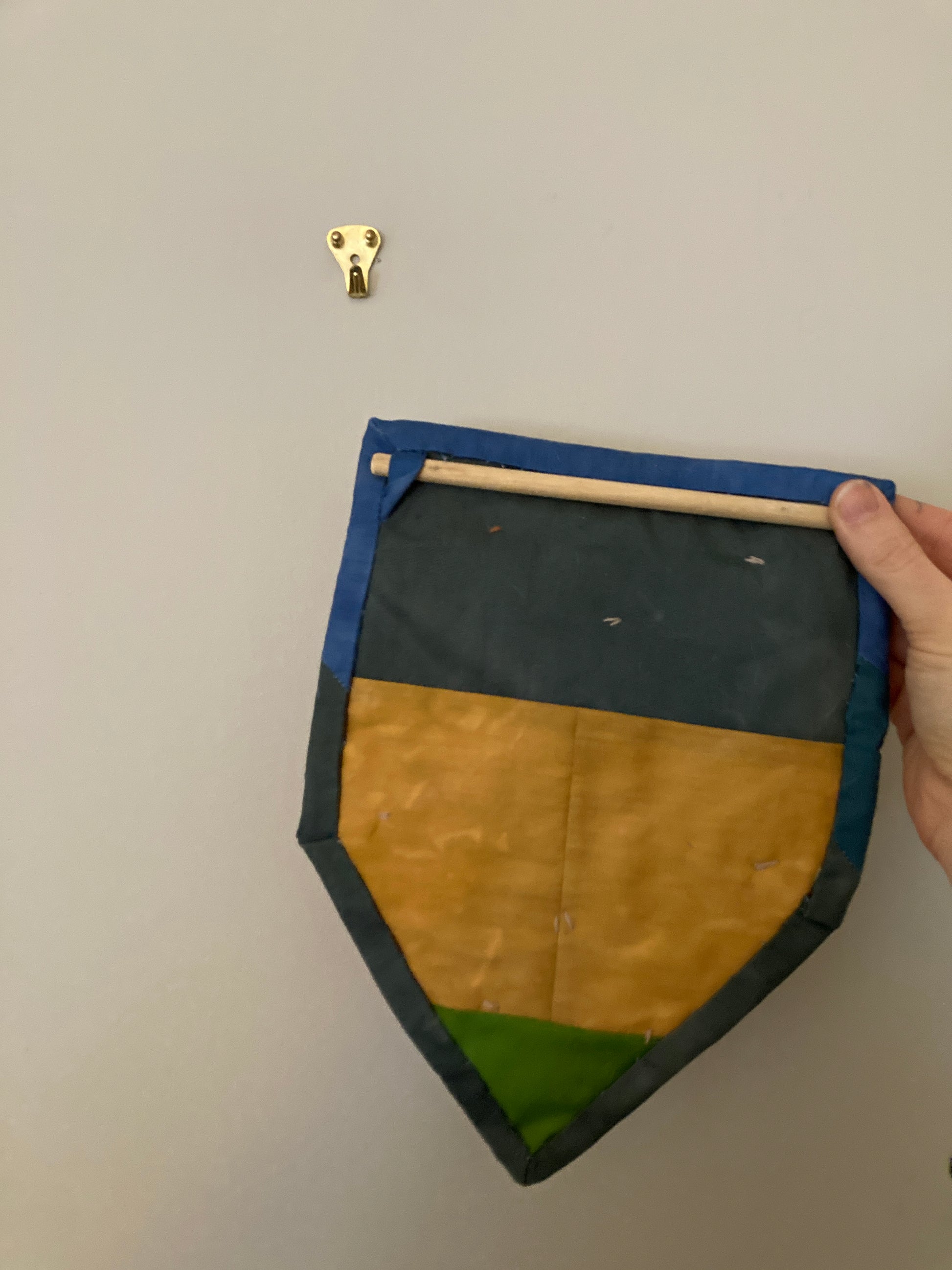Ready for hanging two loops on back (pictured) and wooden dowel.